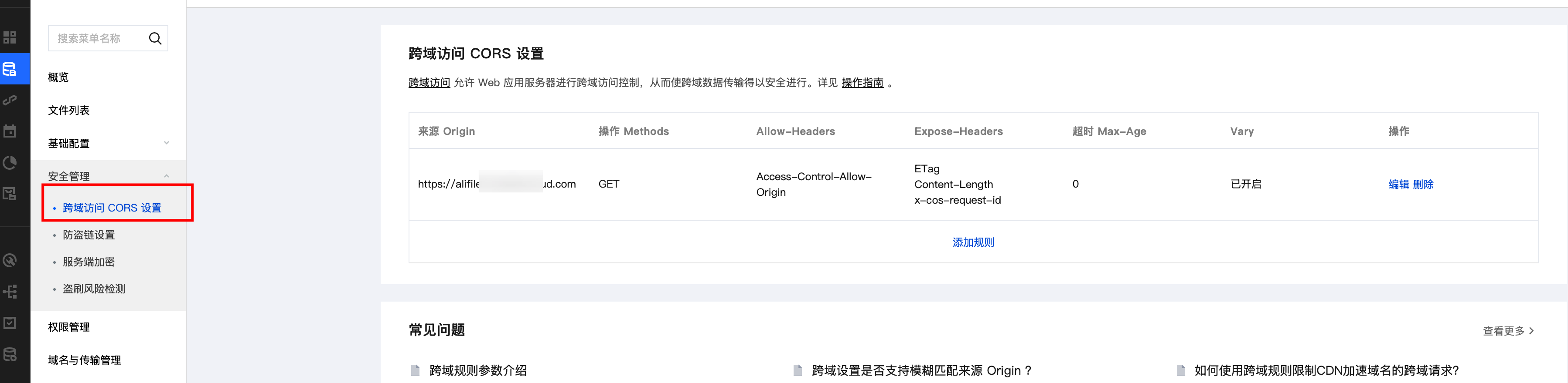 直接引入本地文件地址,本地测试没问题,但是线上就失效了。所以需要把字体文件传到文件服务器里,我这里使用的是腾讯cos。 需要设置一下cors .要不产生跨域资源共享(CORS)问题,无法加载字体